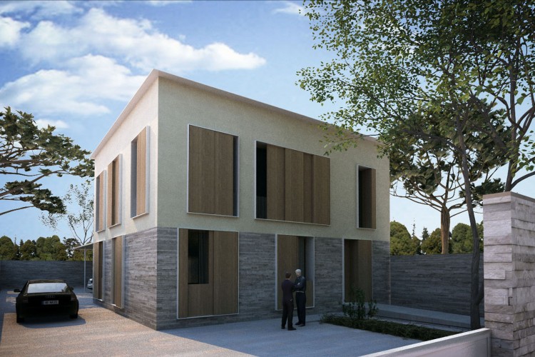 Si tratta di un progetto (Faenza, RA, 2009) dall’aspetto lineare fondato su minimi accorgimenti compositivi: da una superficie bipartita matericamente (pietra di rivestimento al piano terra, intonaco al piano superiore) si aprono cornici di pietra bianca aventi la stessa altezza ma con larghezze differenti, a testimoniare l’eterogeneità spaziale degli ambienti interni. Le stesse cornici, di poco sporgenti rispetto il filo della facciata, presentano al loro interno un sistema di oscuramento in pannelli lignei. Il fronte retrostante si aggiunge di una volumetria di servizio (autorimessa e terrazza) schermandola con un frangisole ligneo dal lato della corte arbustata.